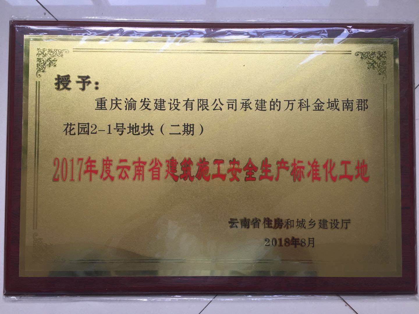 我司承建的昆明萬科金域南郡花園2-1號(hào)地塊(二期)工程、昆明萬科金域南郡花園3號(hào)地塊二標(biāo)段三期工程榮獲“云南省建筑施工安全生產(chǎn)標(biāo)準(zhǔn)化工地”稱號(hào)。